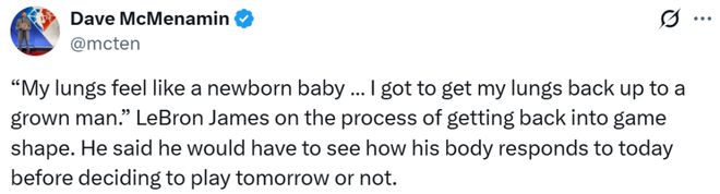 詹姆斯表示,会根据今天身体的反应,来决定明天是否出战。詹姆斯还说恢复到成年人的体能水平,只有通过上场比赛才能实现。