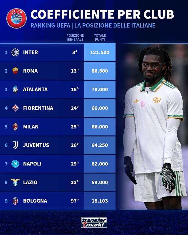 国际米兰凭借强劲的欧战表现,尤其是连续两年闯入欧冠决赛,积累了大量的欧战积分,而罗马的稳定表现也使其位居第二。相比之下,AC米兰和尤文图斯的排名则较为落后,分别排在第五和第六位。这一数据也反映了意甲近几年在欧洲赛场上的竞争格局变化。