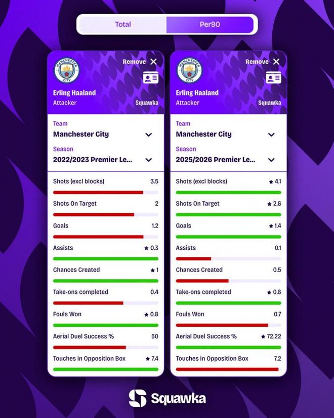 Squawka统计了哈兰德22-23赛季(英超36球创纪录)和本赛季的数据,并做出对比。